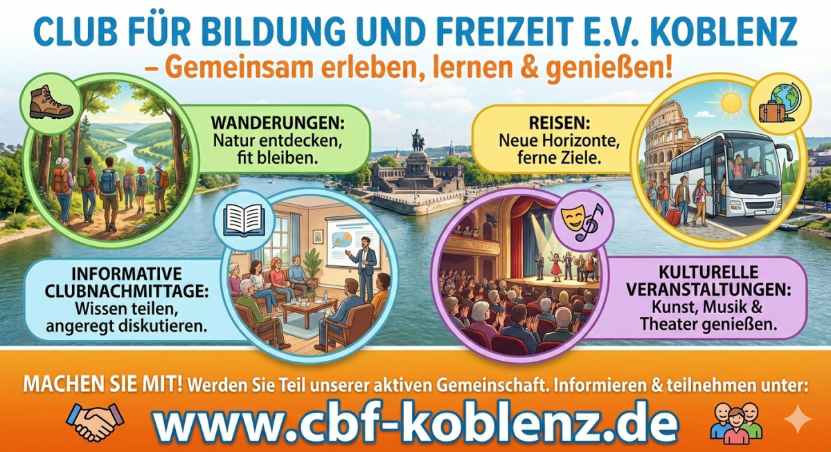 Ein Informationsflyer und ein Plakat über den Club für Bildung und Freizeit e.V. Koblenz dienen der Information und der Werbung